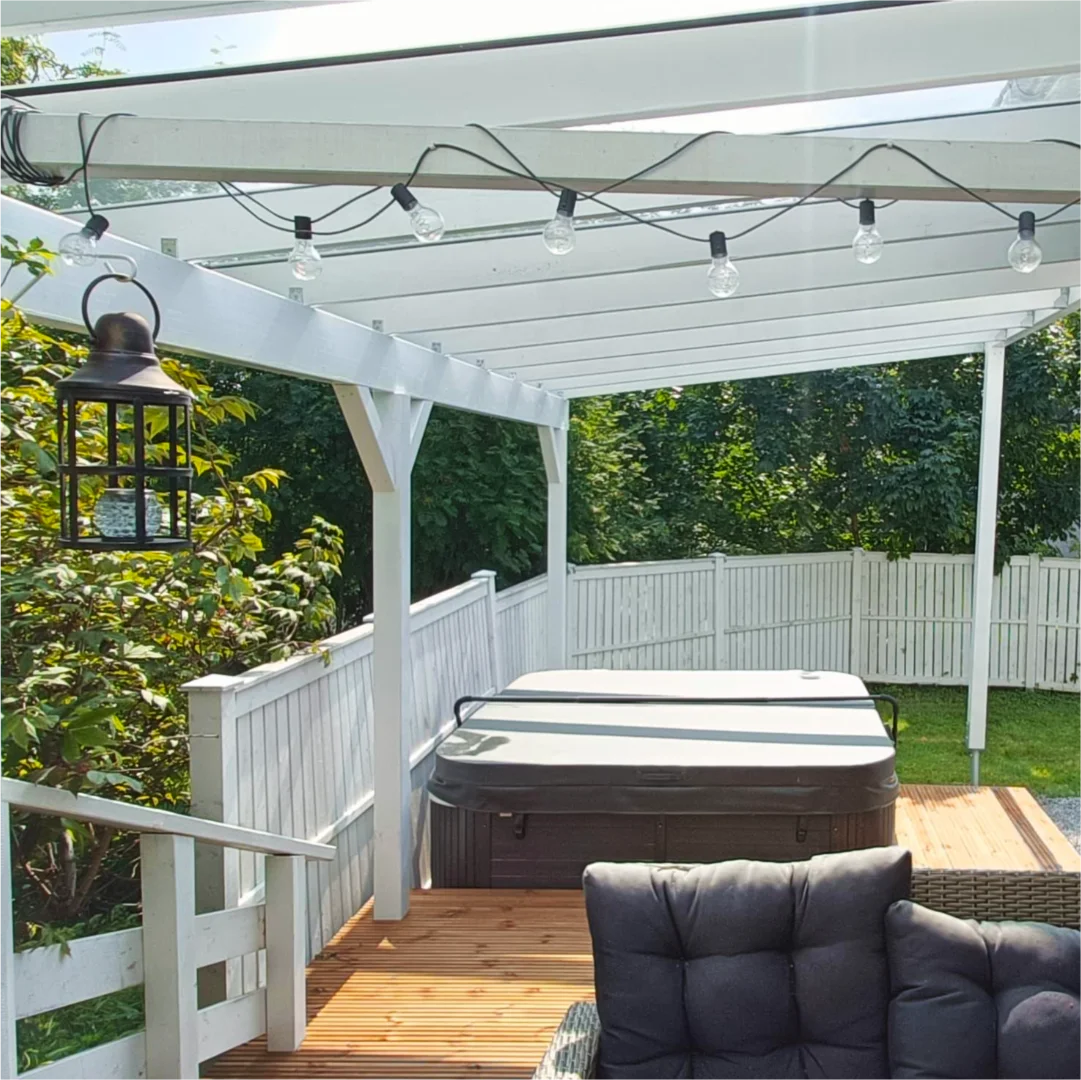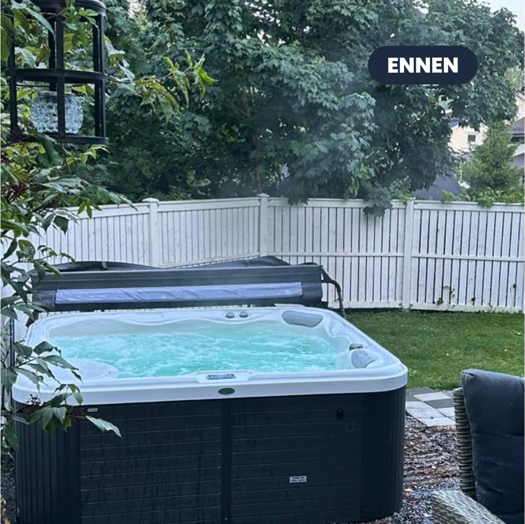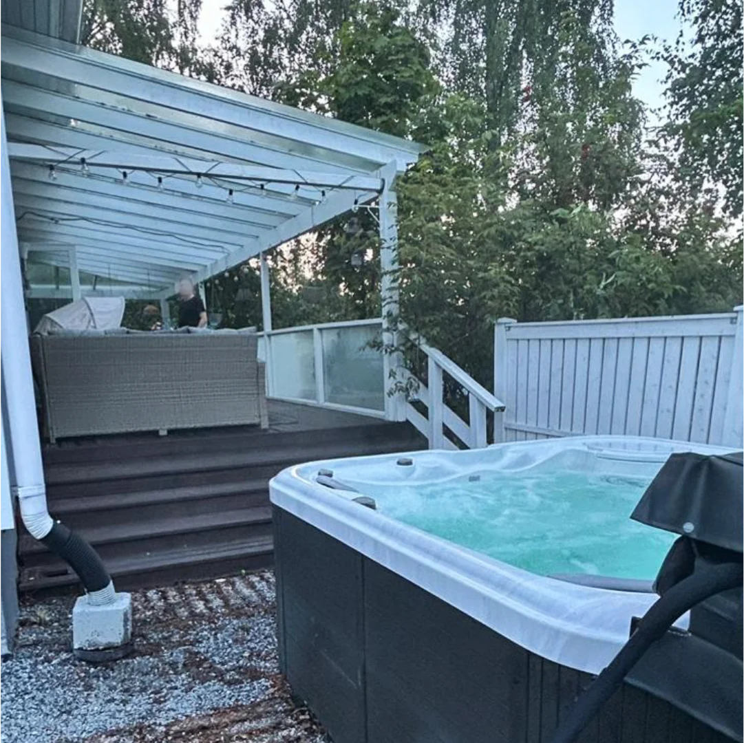 • Talon takapihalla on poreallas ja altaan ympärillä on valkoinen korkea säleaita näkösuojana