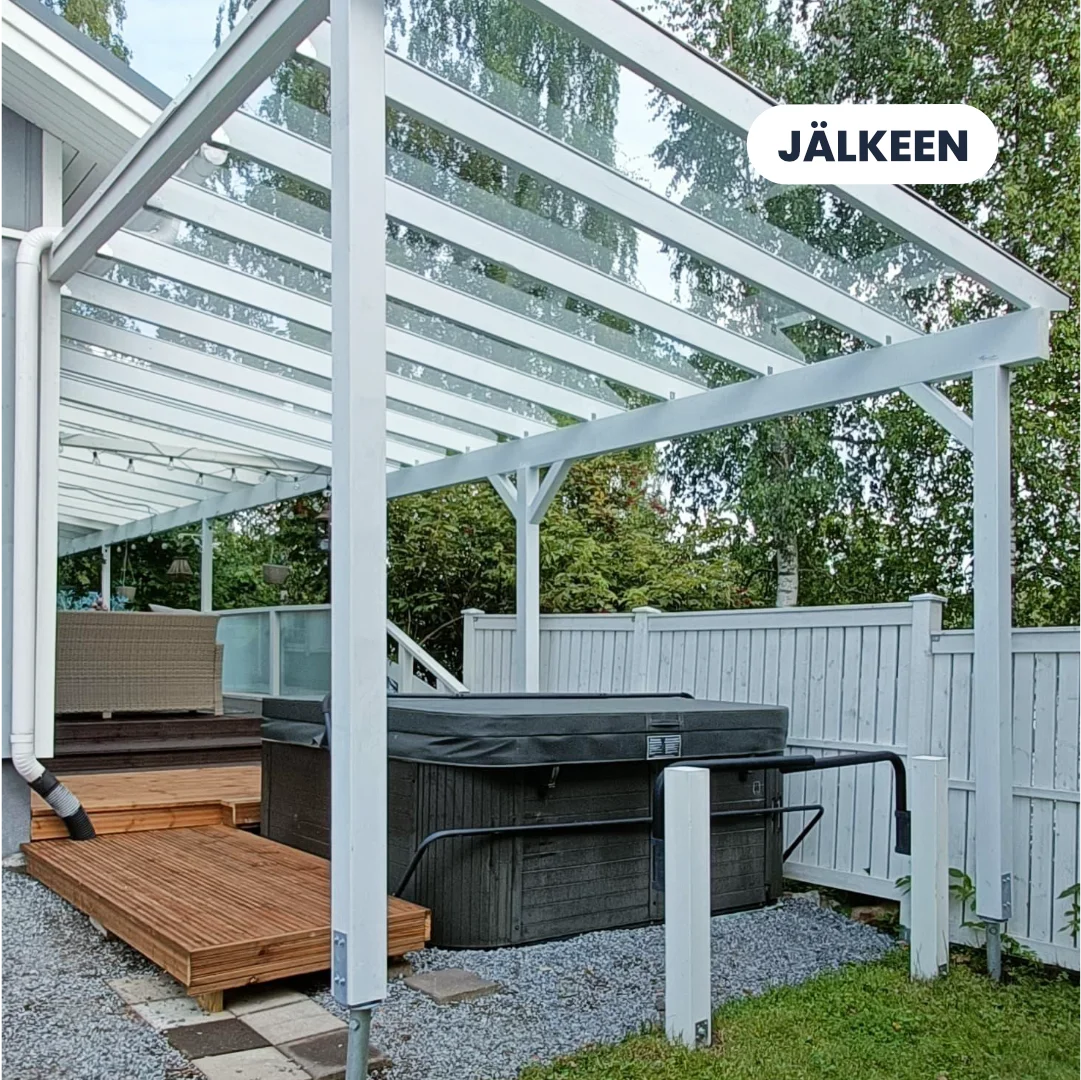 "Tilasimme kesällä 2025 Pirkanmaan Rakennuspalvelulta ulkoporeammeellemme terassin lasikatoksen. Lähtötilanteessa ongelmana oli, että ulkoporeamme oli täysin sään armoilla ja sen käyttö sekä kulku olivat ajoittain hankalia.